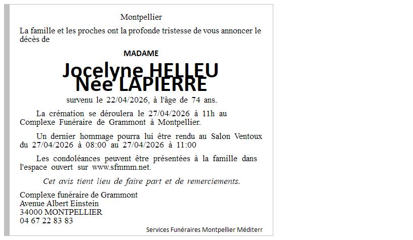 Complexe funéraire de Grammont le lundi 27 avril à 11 heures