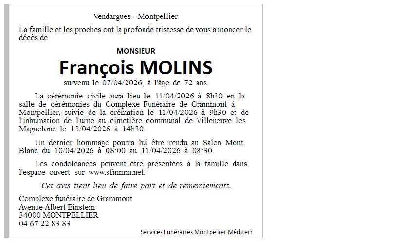 Avis de décès de Monsieur François MOLINS