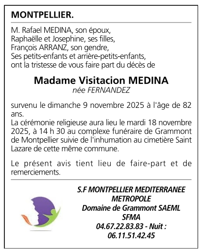 Décédée à Montpellier (34000, France) le dimanche 9 novembre 2025 à l'âge de 82 ans