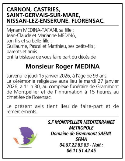 Décédé à Carnon Plage (34280, France) le jeudi 15 janvier 2026 à l'âge de 93 ans
