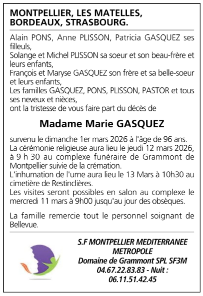 Décédée à Montpellier (34000, France) le dimanche 1 mars 2026 à l'âge de 96 ans