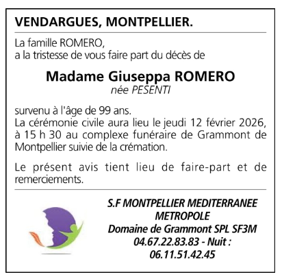 Décédée à Vendargues (34740, France) le vendredi 30 janvier 2026 à l'âge de 99 ans