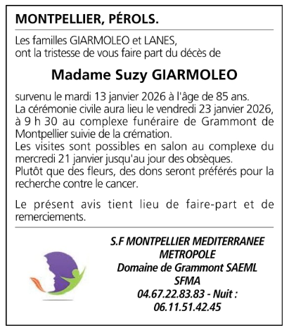 Décédée à Montpellier (34000, France) le mardi 13 janvier 2026 à l'âge de 85 ans