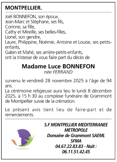 Décédée à Montpellier (34000, France) le vendredi 28 novembre 2025 à l'âge de 94 ans