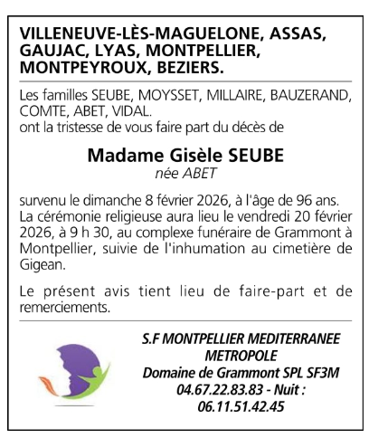 Décédée à Villeneuve-lès-Maguelone (34750, France) le dimanche 8 février 2026 à l'âge de 96 ans